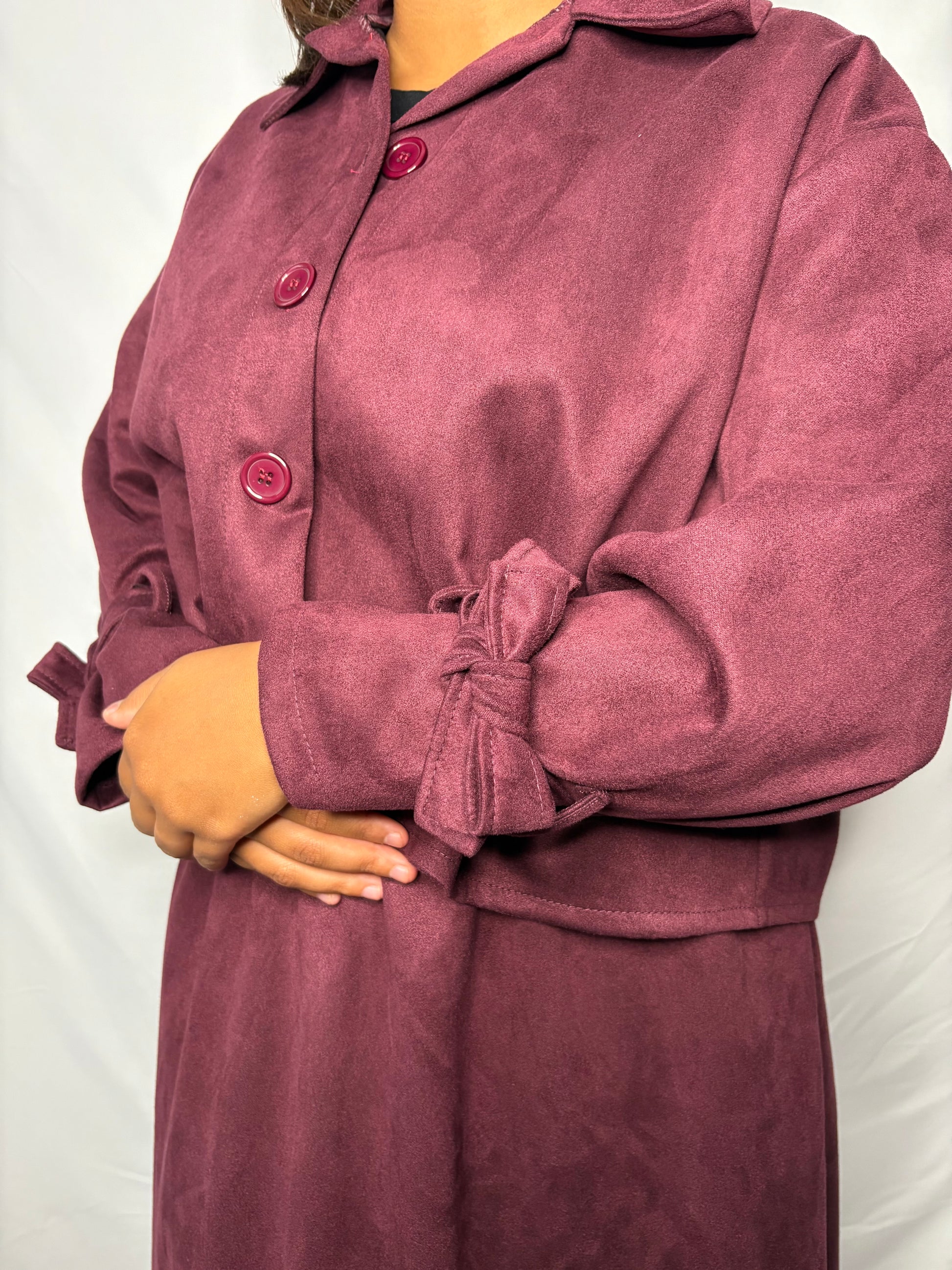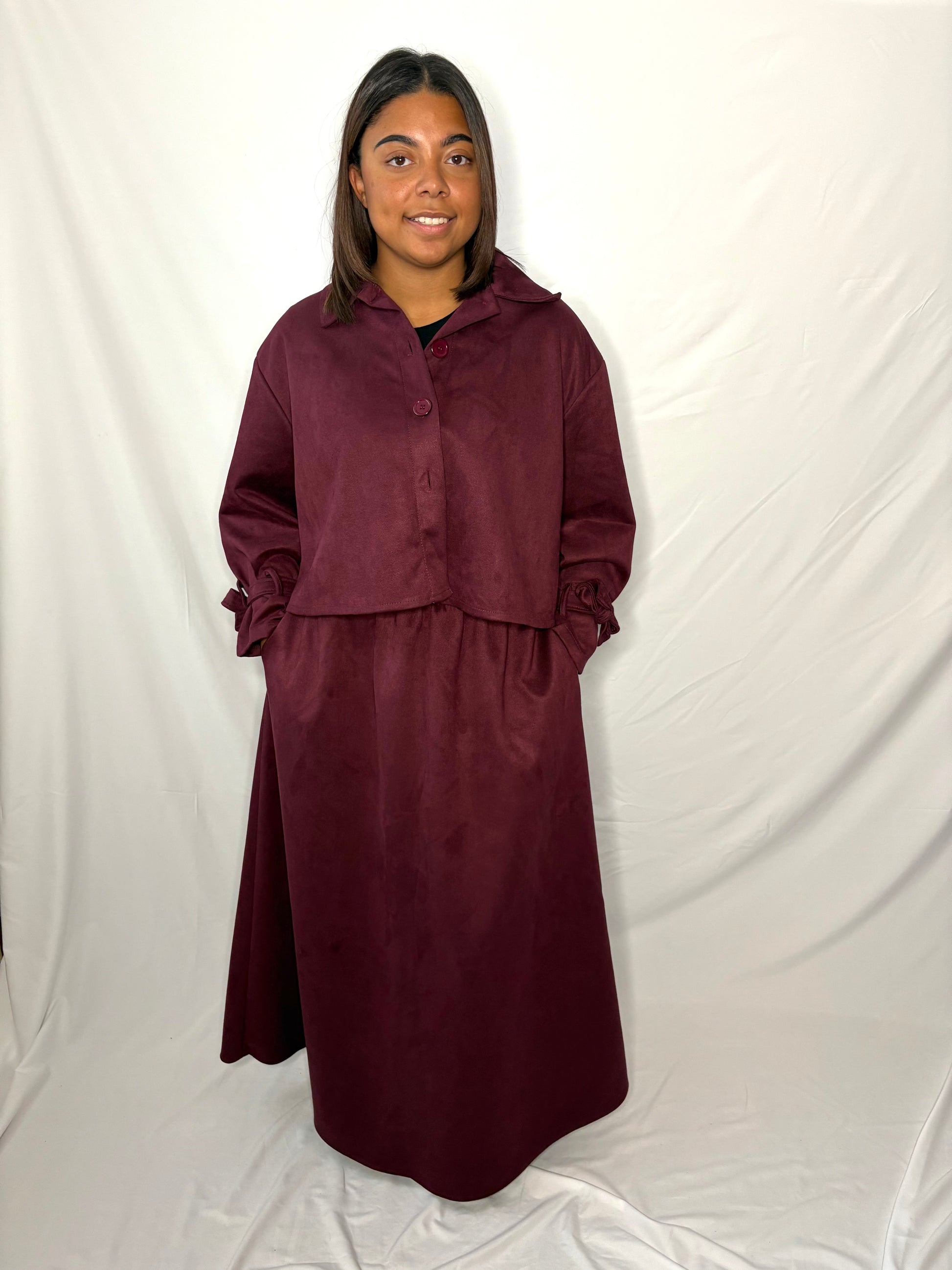 Cet ensemble en suédine marron se compose d’une veste boutonnée et d’une jupe longue fluide. Idéal pour un look automnal chic et confortable.