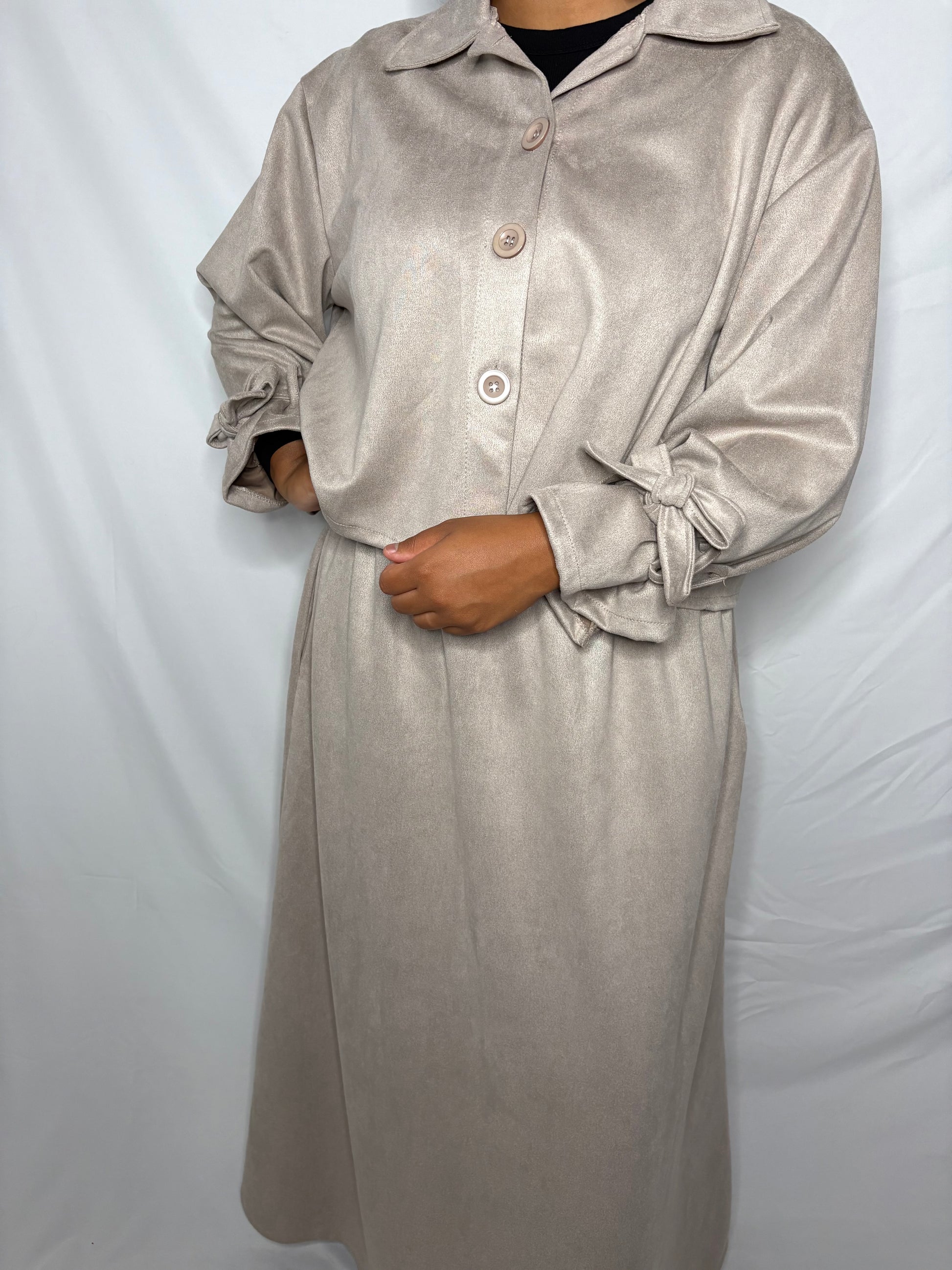 Cet ensemble en suédine marron se compose d’une veste boutonnée et d’une jupe longue fluide. Idéal pour un look automnal chic et confortable.